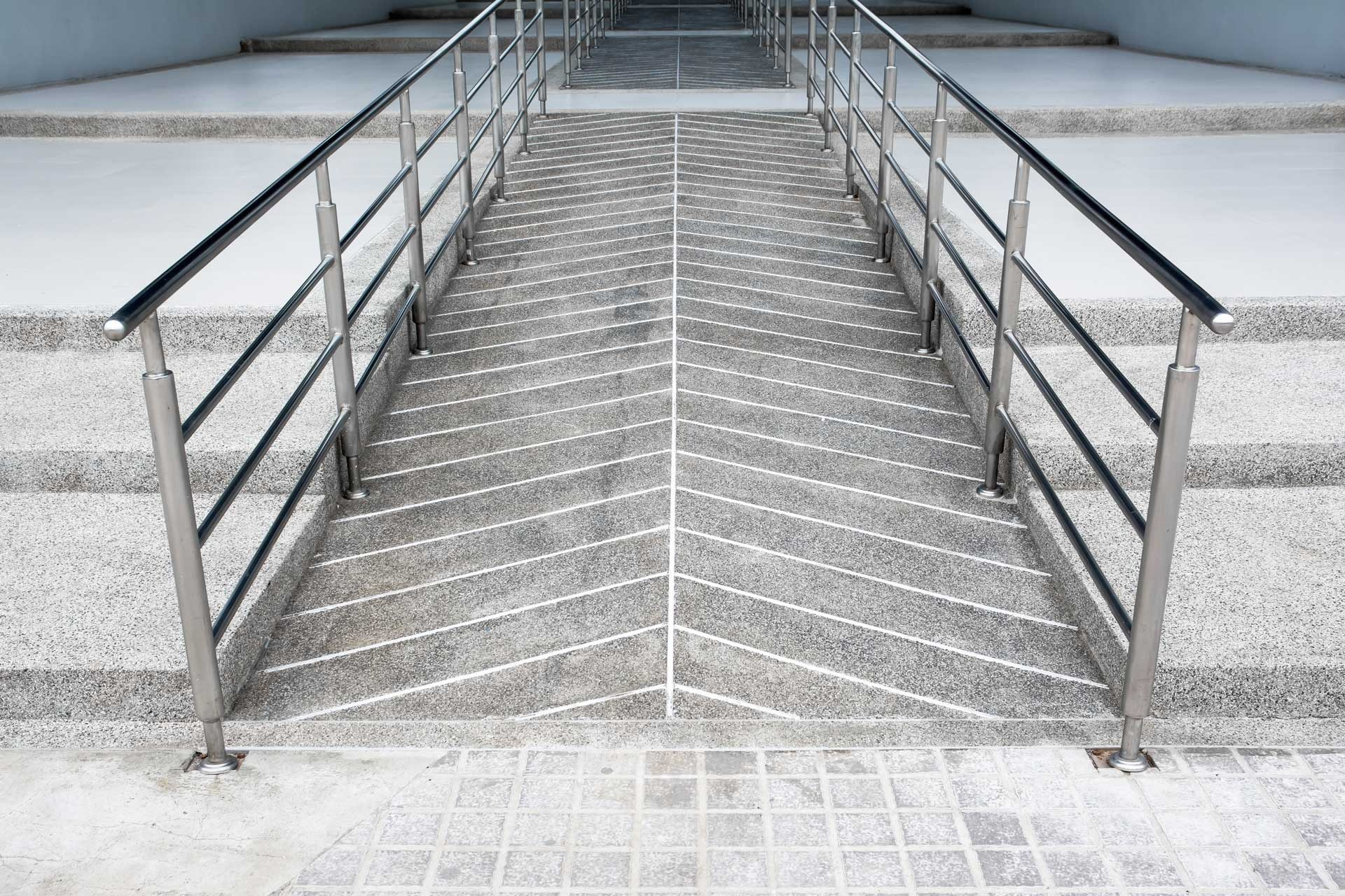 Otra sería el pasamanos doble en todo el tramo de la rampa para sillas de ruedas. Estos podrán estar a ambos lados de la rampa, con una altura de entre 70 a 80 centímetros uno, y el otro a una altura de entre 90 y 105 cm.